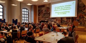 Die Schulstiftung hatte zum Zwischenbericht bereits ein 14-seitiges Positionspapier erarbeitet, das die beiden Stiftungsvorstände zusammen mit Holger Schieck in groben Zügen umrissen. Zwar seien die 93 evangelischen Schulen mit ihren rund 17400 Schülerinnen und Schülern sehr vielfältig. Aber sie „haben gemeinsame Standards – ein evangelisches Profil“ und sich damit auf einen Orientierungsrahmen geeinigt, so Volker Schmidt. Sein Fazit und Ziel: „Schulen können zu echten Kirchorten werden, an denen Gemeinde entsteht.“ Dafür müssten das evangelische Profil weiter geschärft und Kooperationen vertieft werden.
